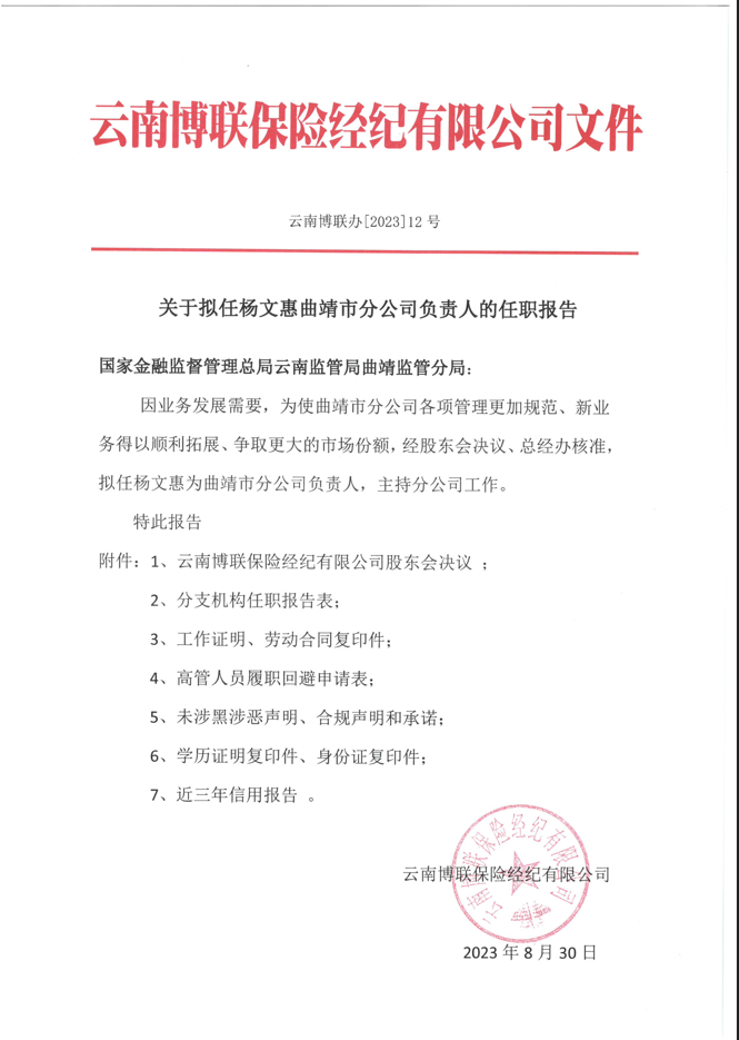 關(guān)于擬任楊文惠曲靖市分公司負(fù)責(zé)人的任職報告