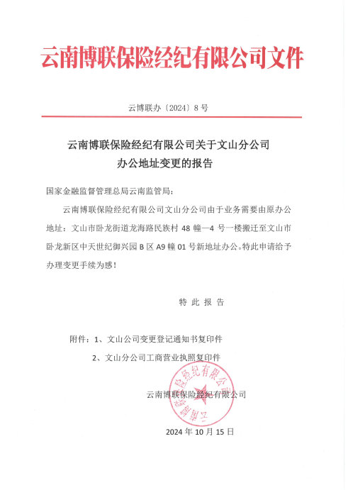 云南博聯保險經紀有限公司關于文山分公司辦公地址變更的報告